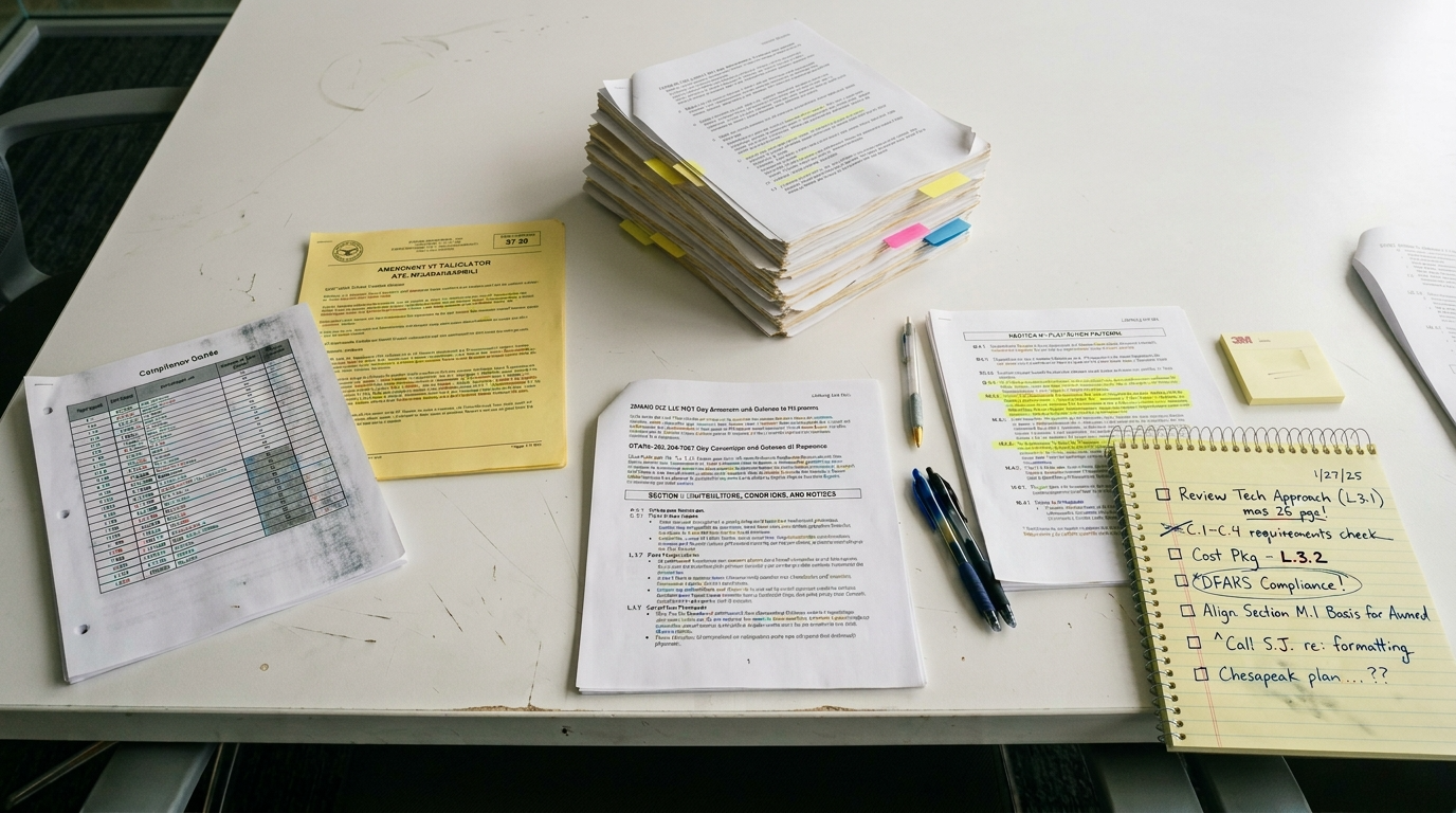 Capture operations software that turns solicitations into execution-ready workspaces. Built for defense contractors who cannot afford compliance misses.